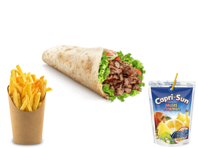 mini galette wrap, salade, tomate, sauce au choix, 1 petite frite, 1 boisson caprisun